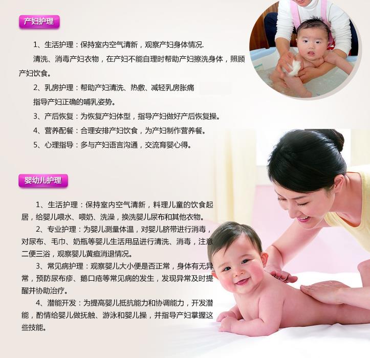 1、產(chǎn)婦護理:生活護理、乳房護理、產(chǎn)后恢復、營養(yǎng)配餐、心理指導等