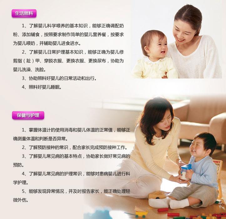 除要完成初、中級嬰幼兒護(hù)理人員的工作外,還應(yīng)該做到: 1.給嬰幼兒開展啟蒙訓(xùn)練。為新生兒提供早期智力開發(fā)和啟蒙訓(xùn)練,培養(yǎng)良好的生活衛(wèi)生習(xí)慣; 2.使用普通話與嬰幼兒進(jìn)行語言交流、給嬰幼兒講故事、說兒歌,陪嬰兒玩游戲等。 |